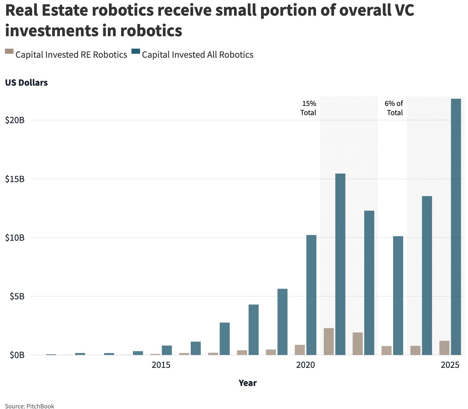 This could soon change because of intensive technology investment. Capital invested in robotics for CRE use cases fluctuates around USD 1 billion, which made up approximately 6% of robotics VC investment last year. This year, over USD 20 billion venture capital funding is flowing into robotics, projected to exceed 2024, according to PitchBook. Although current VC robotics investments are heavily focused on consumer, logistics, and security sectors, these technology developments are also quickly transferring to CRE use cases.