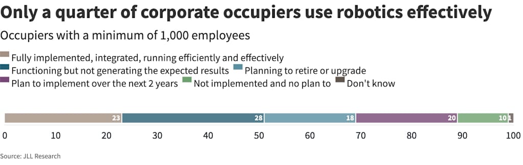 The equation is not simply about replacing humans with robots in the exact same workflows doing the same tasks. It is about if robots can justify their cost by providing better outcomes, for example, through enabling new workflows or collecting better data to support decision making . In the JLL Global Tech Survey, both occupiers and investors have reported that data-related workflows are their priority areas for AI pilots. This is an area where robotics have visible advantages.