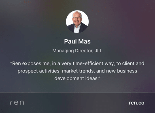 We started Ren in 2020 to help professionals turn relationships into opportunities. Our technology analyzes millions of paywalled news and data sources in real-time to surface revenue-generating signals that aren’t on LinkedIn. Producers across JLL leverage Ren to stay on top of important news on their network, discover opportunities, and send contextual outreach that cuts through the noise with prospects and clients.