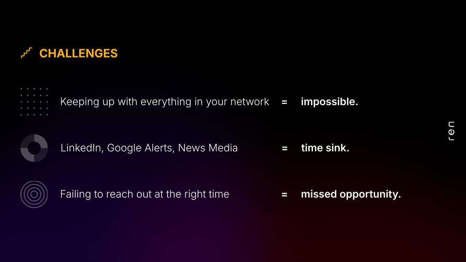 Ren’s platform integrates seamlessly with the user’s existing workflows and can ingest data from CRMs, social media platforms, calendars, contact lead lists, spreadsheets, and everything in between to build a comprehensive graph of the user’s professional networks. By leveraging this information and matching it against up-to-the-minute news from over 400,000 sources, Ren can arm the user with actionable, relevant updates about key contacts, facilitating timely and meaningful outreach.
